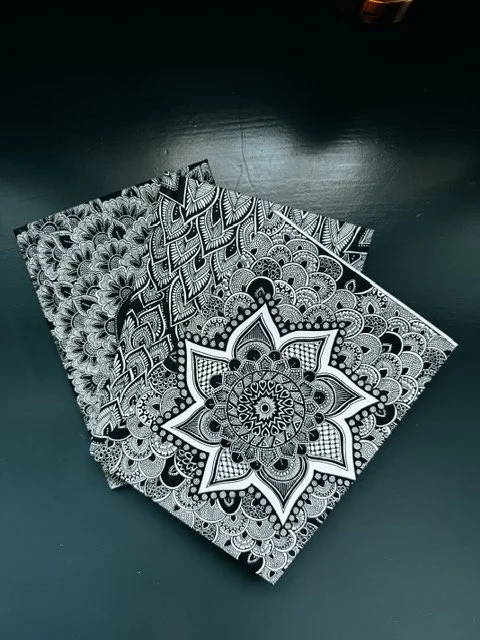 Each design in the Ekta collection is intricately crafted through freehand drawing, using black sharpies. While a protractor and ruler offer occasional support, the true artistry shines in the countless hours dedicated to bringing each piece to life. These designs are more than just art; they are a celebration of balance, precision, and the purity of simplicity.